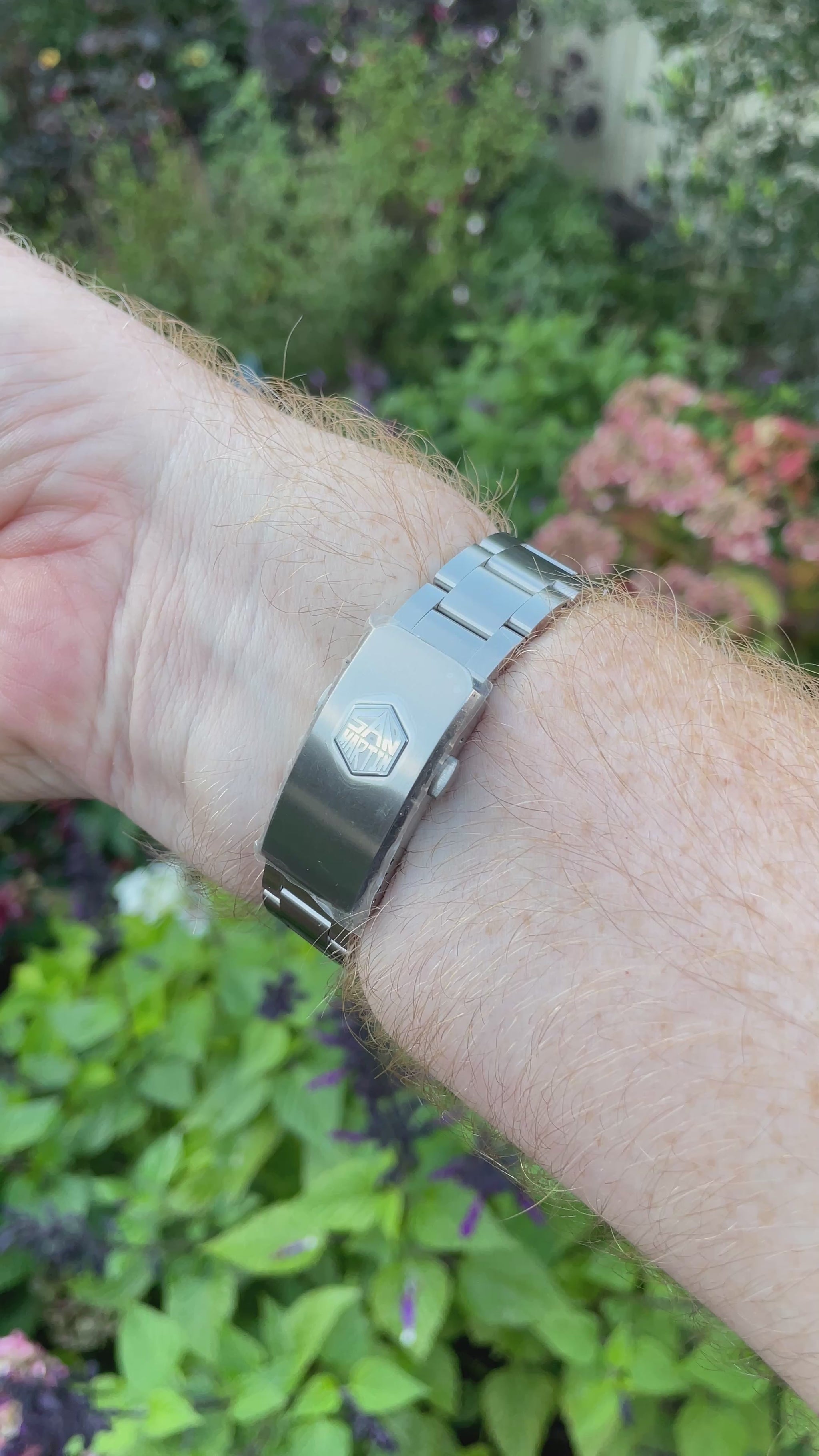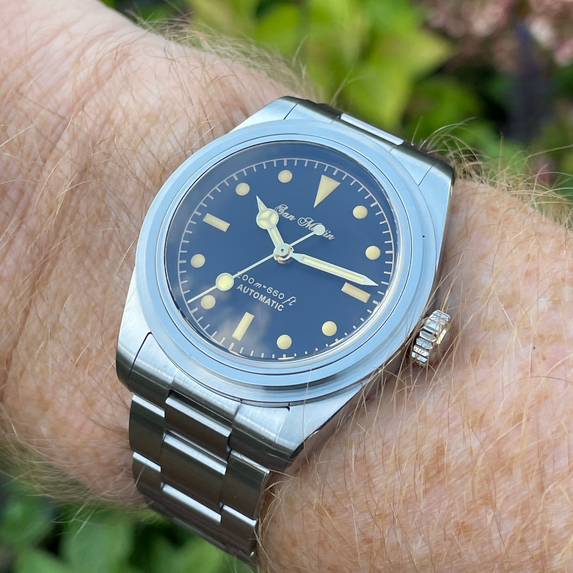 37mm case with a faux vintage lumed dial with San Martin written in script. Mercedes style hand set all under an AR coated Sapphire crystal.