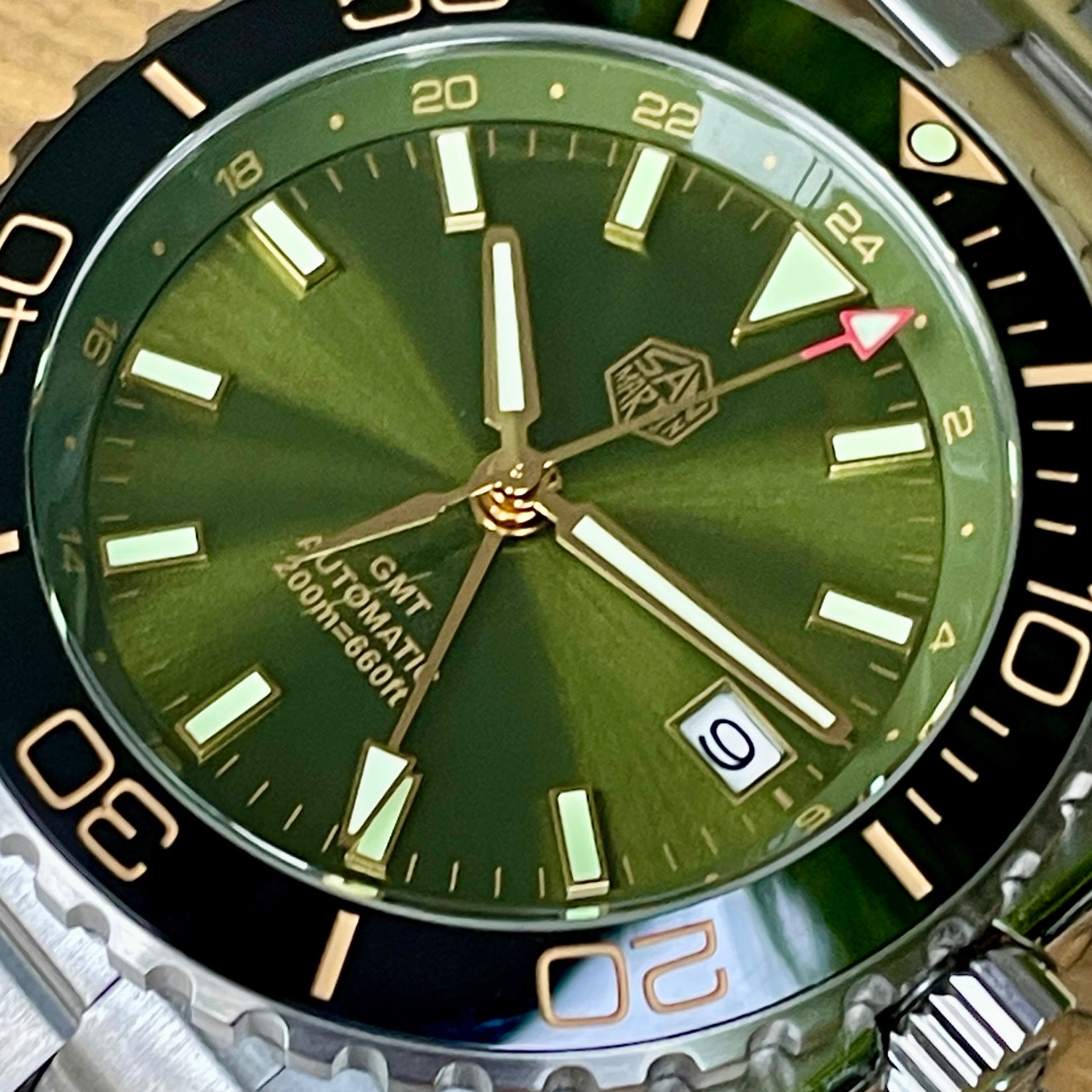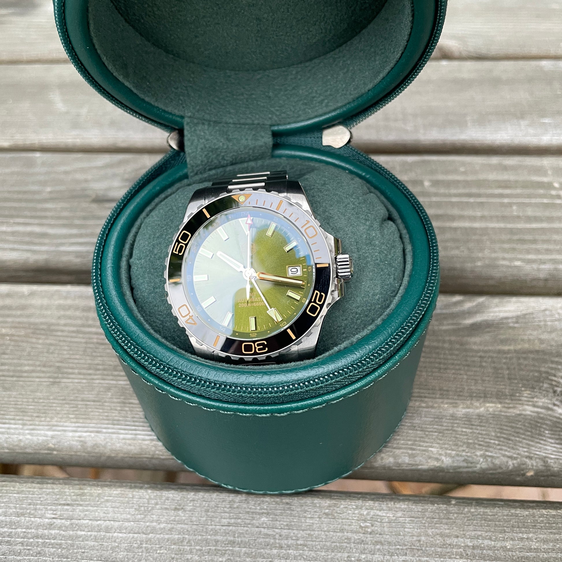 Dial Color: Sunray Enamel Green. Date Window at 3 o'clock