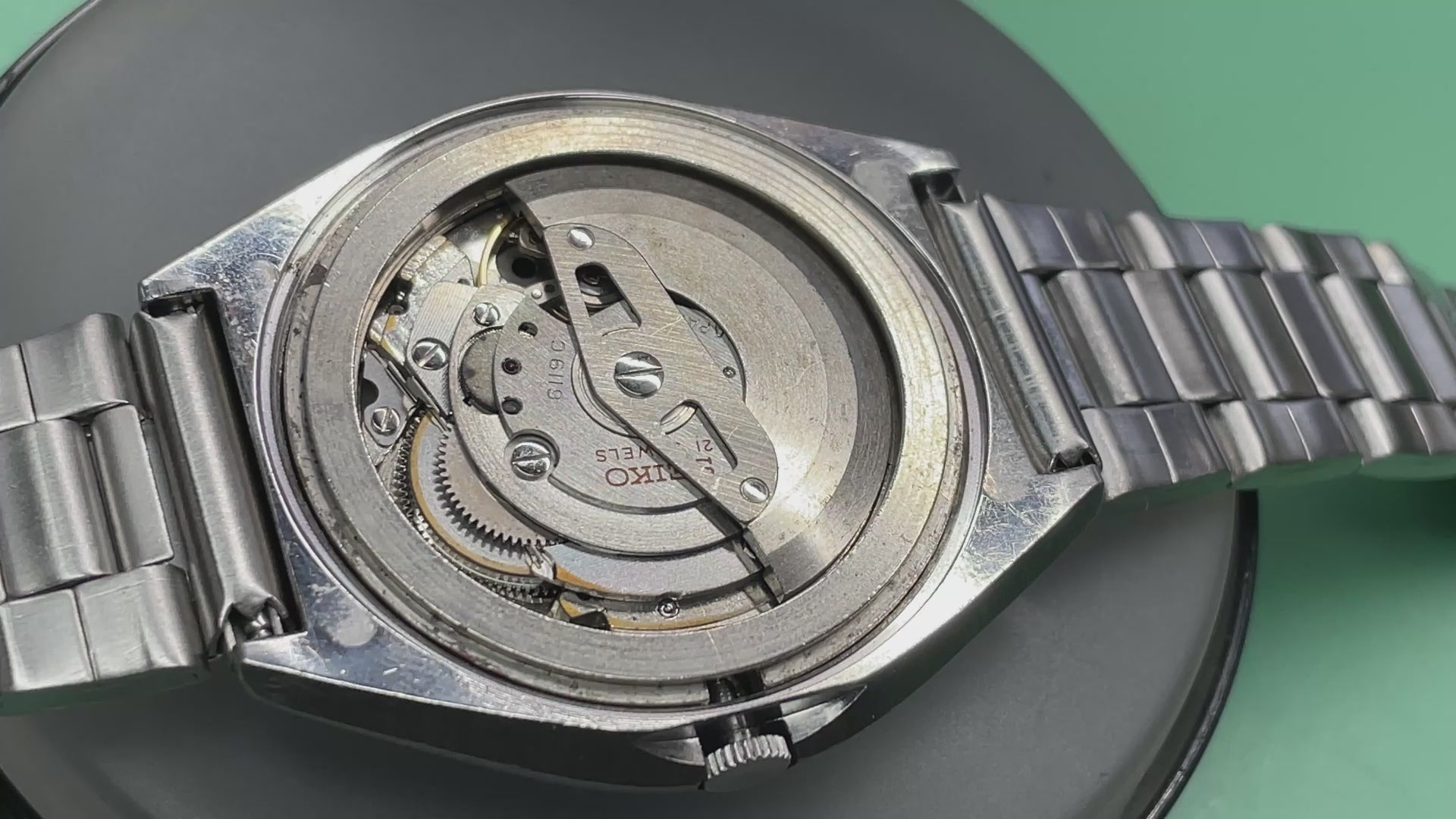 Watch houses a 6119C movement which is actually my favorite Seiko 3 hander movement as it was the first calibre I ever worked on. This movement I have serviced and cleaned and its now running well. Watch offers only an automatic movement, no hand winding or hacking but it does have quickset on the day and date wheels by depressing the crown as shown in the watch in hand video.