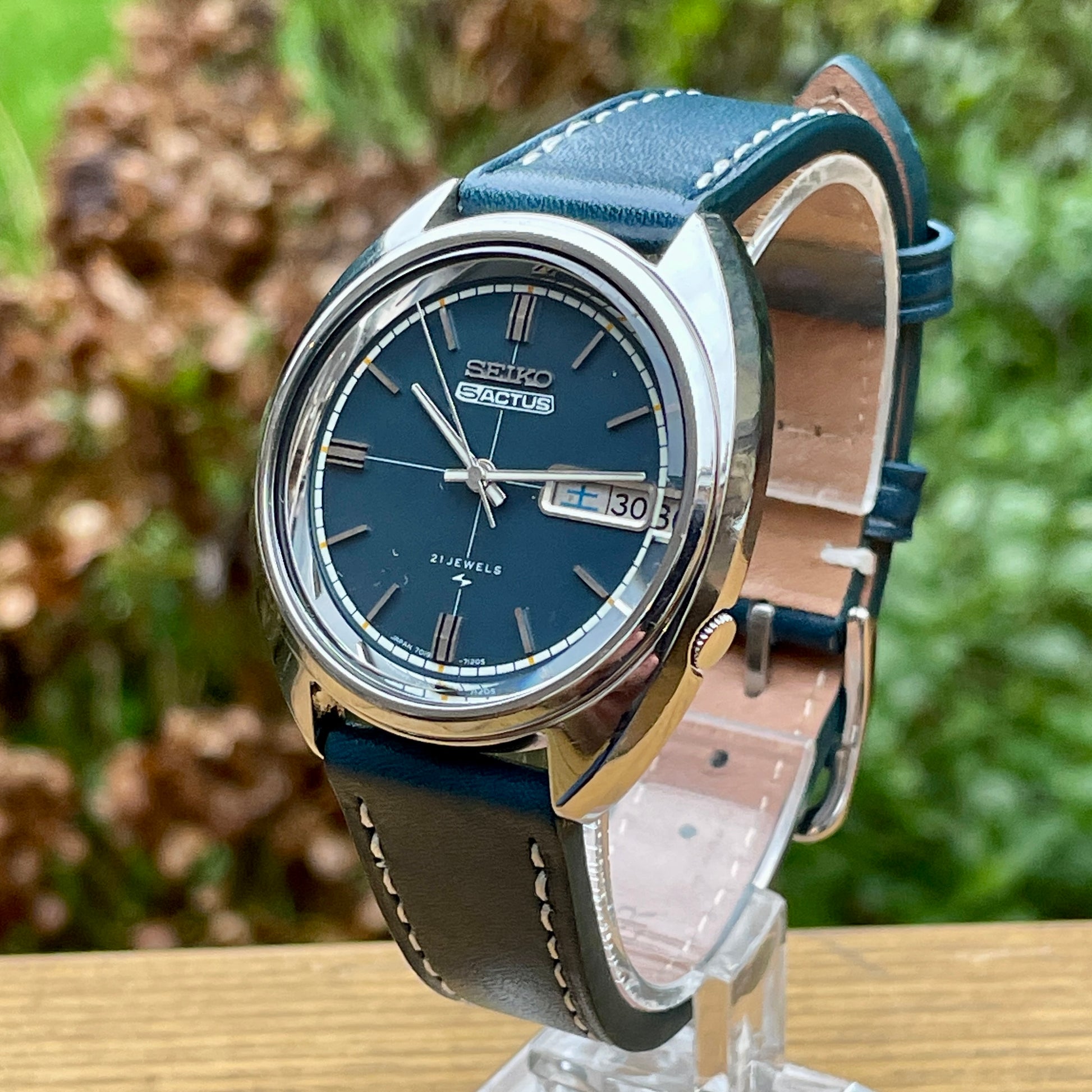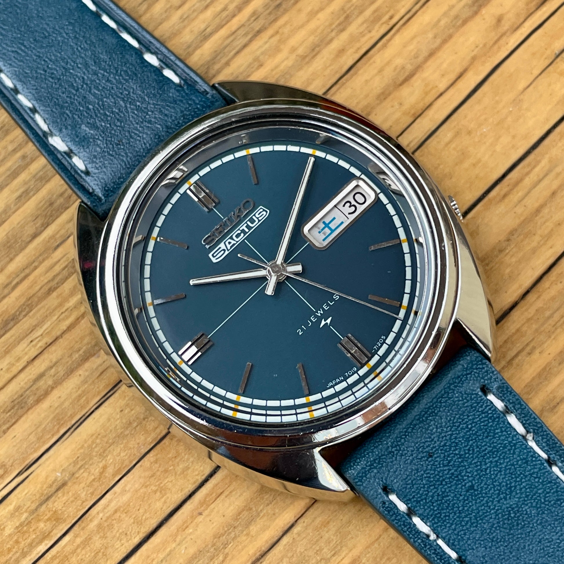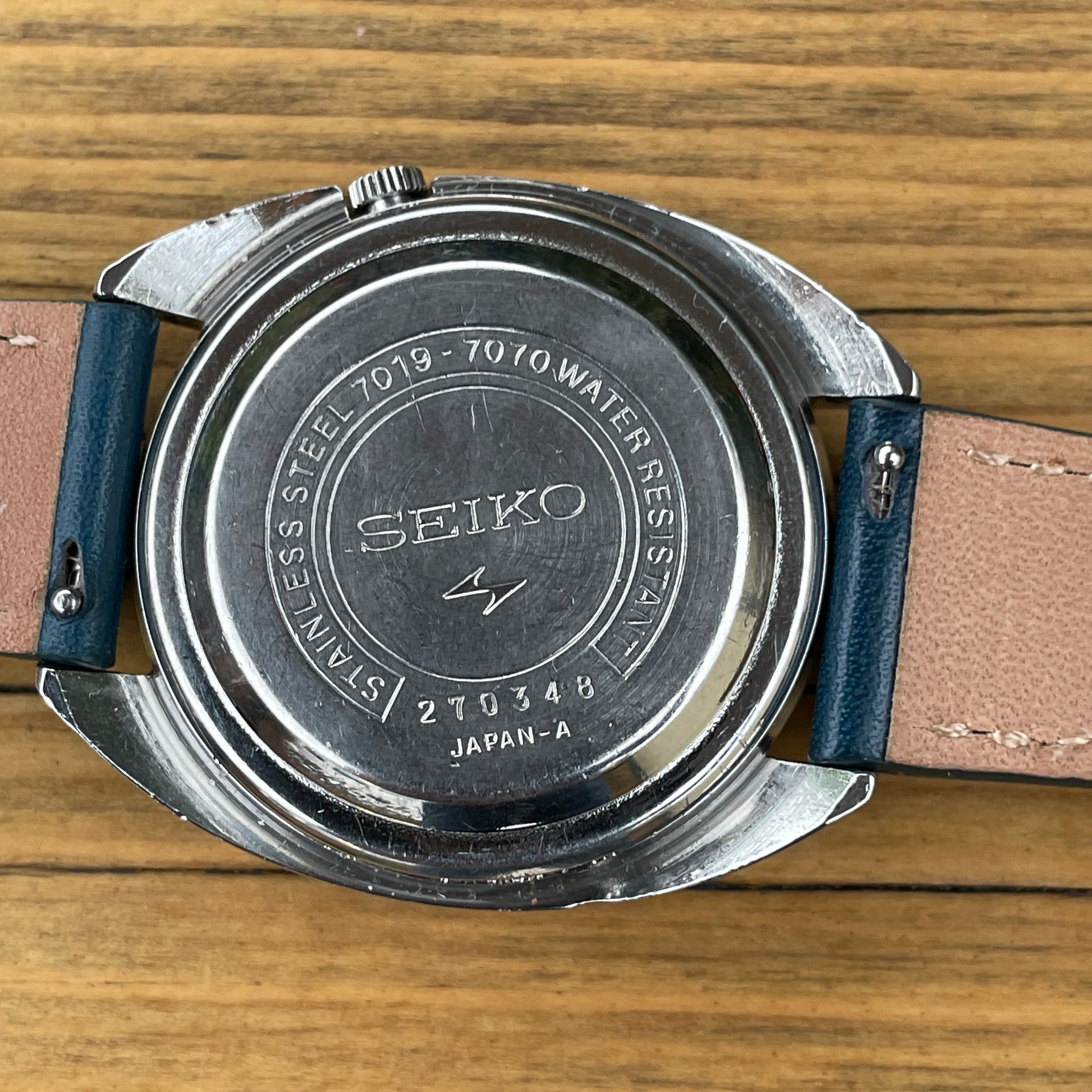 This watch has had a full service and gaskets have been replaced. Its running well and ready to serve. As it is only an automatic this cant be hand wound so only gets its power from the motion of your wrist as you wear it. Watch offers a day / date complication that can be quickset. The 7019 is quickset from pushing the crown in to change the day, which is in Kanji or English, you can choose. Pull the crown out to first position and rotate to change the date.