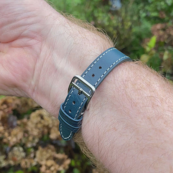 Fitted on a leather strap of a matching colour to the dial to complete the look.